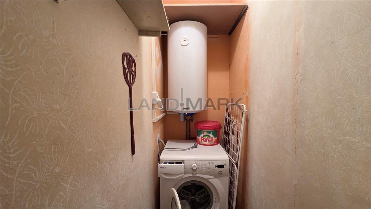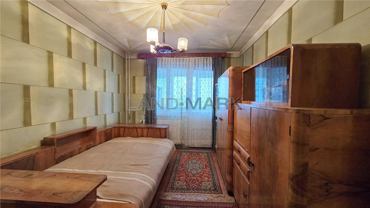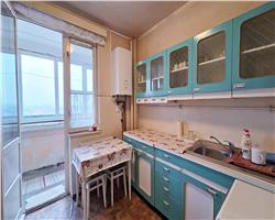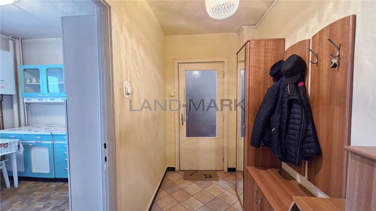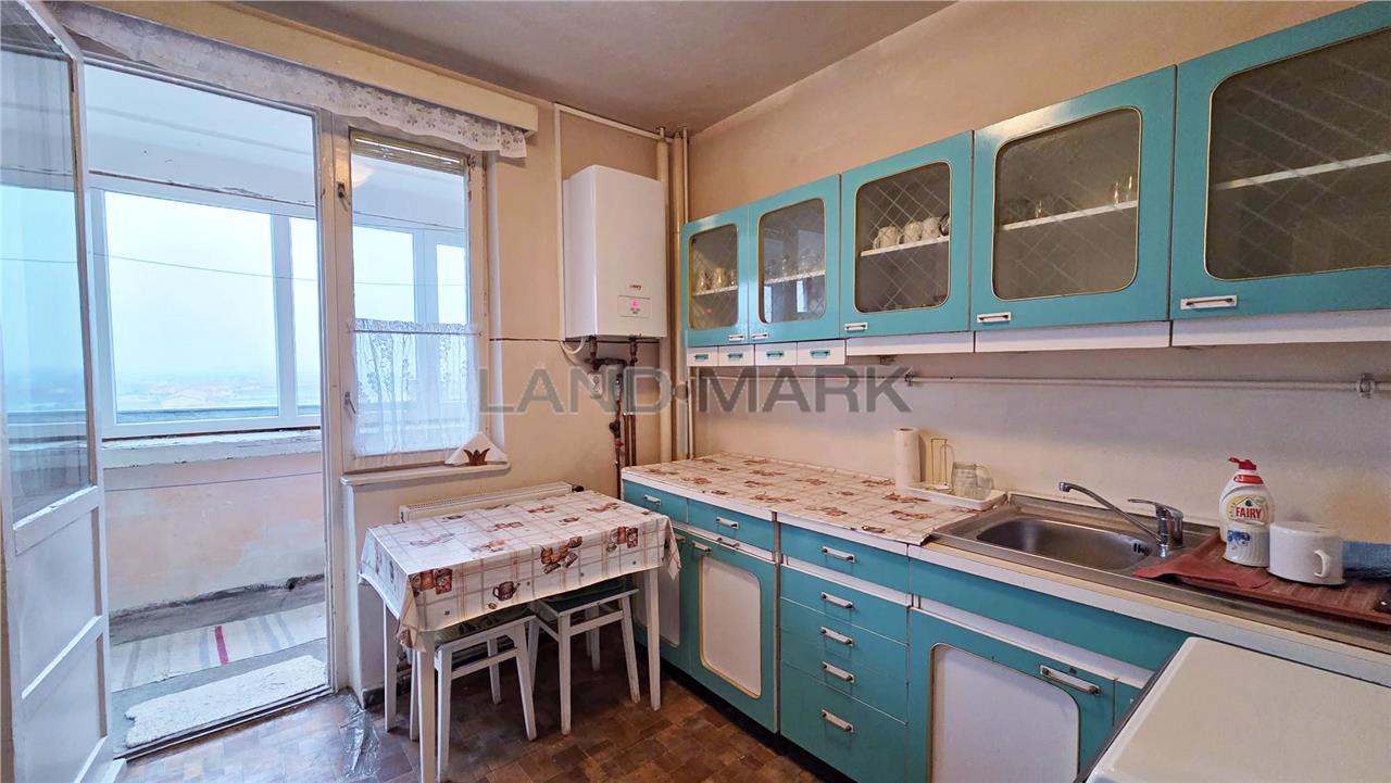 Este compartimentat astfel: hol acces, usa intrare metalica,bucatarie inchisa + balcon inchis cu posibilitate de marire bucatarie + camara, o camera de zi, alt hol, camera copii, baie cu vana, zona pentru masina de spalat cu posibilitate de modificare in wc de serviciu si domitor cu balcon inchis.Apartartamentul necesita renovare completa, tamplaria este din termopan, doar geamurile care despart camera de balcon sunt din lemn, podelele sunt amenajate cu gresie si cu parchet din lemn in stare buna, iar incalzirea se realizeaza cu centrala proprie pe curent cu posibilitate de racordare la gaz. Mobila din hol si camera de copii este in stare buna, relativ noua, deasemenea si frigiderul si masina de spalat. Apartamentul fiind pozitionat la et 9, vederea este foarte placuta, este liniste si nu este praf.