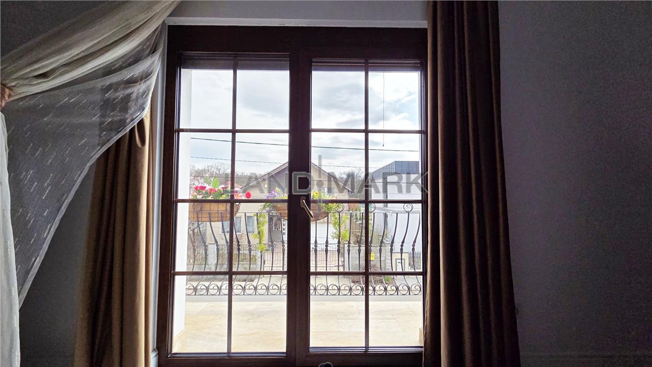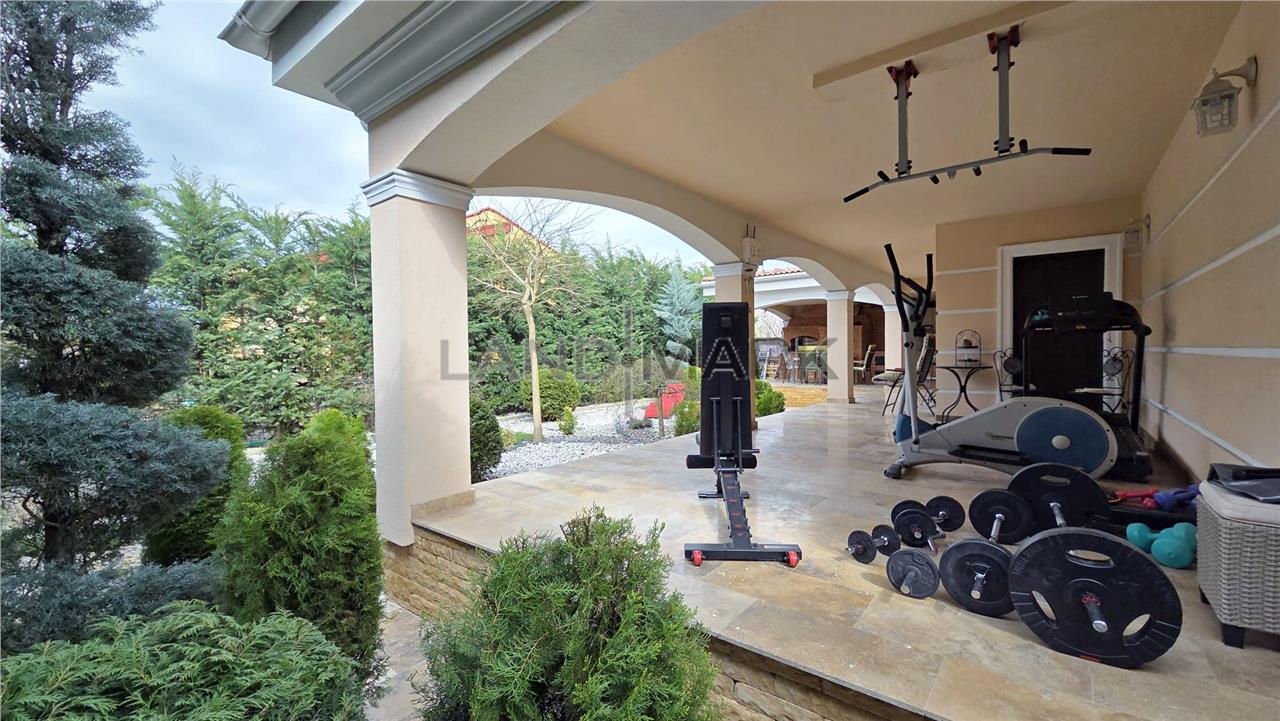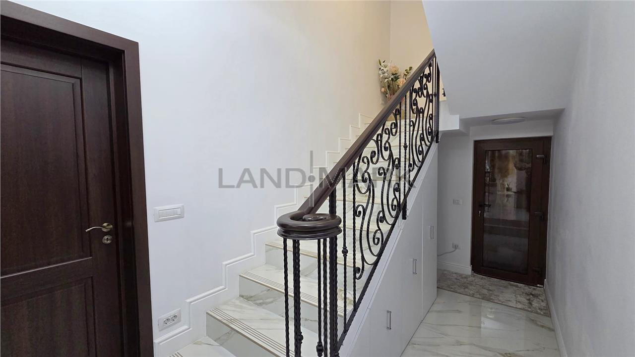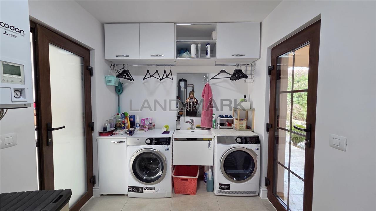 La parter, proprietatea te întâmpină cu un hol de acces primitor, o baie modernă cu duș, precum și un dormitor. Zona de zi este definită de un living generos, luminos, perfect pentru relaxare și socializare, iar bucătăria inchisa, frumos mobilata si utilata, oferă funcționalitate și intimitate. Atât livingul, cât și bucătăria au acces direct către două terase acoperite, decorate cu travertin, însumând aproximativ 60 mp – un spațiu ideal pentru petrecerea timpului în aer liber, complet echipat cu zonă de dining, cuptor de pizza, grătar, mobilier și baie proprie. De asemenea, există acces direct din casă către garaj de 30 mp plus camera tehnica si spalatorie.