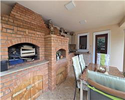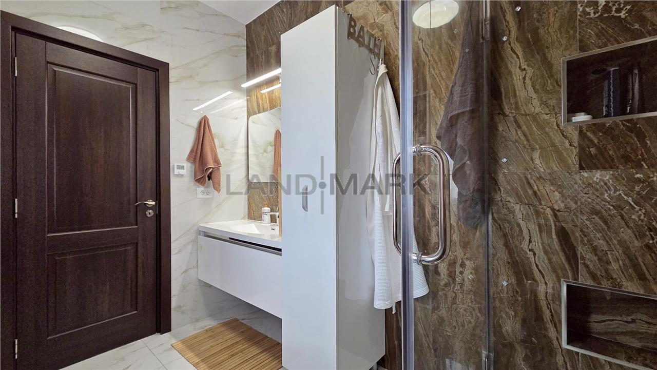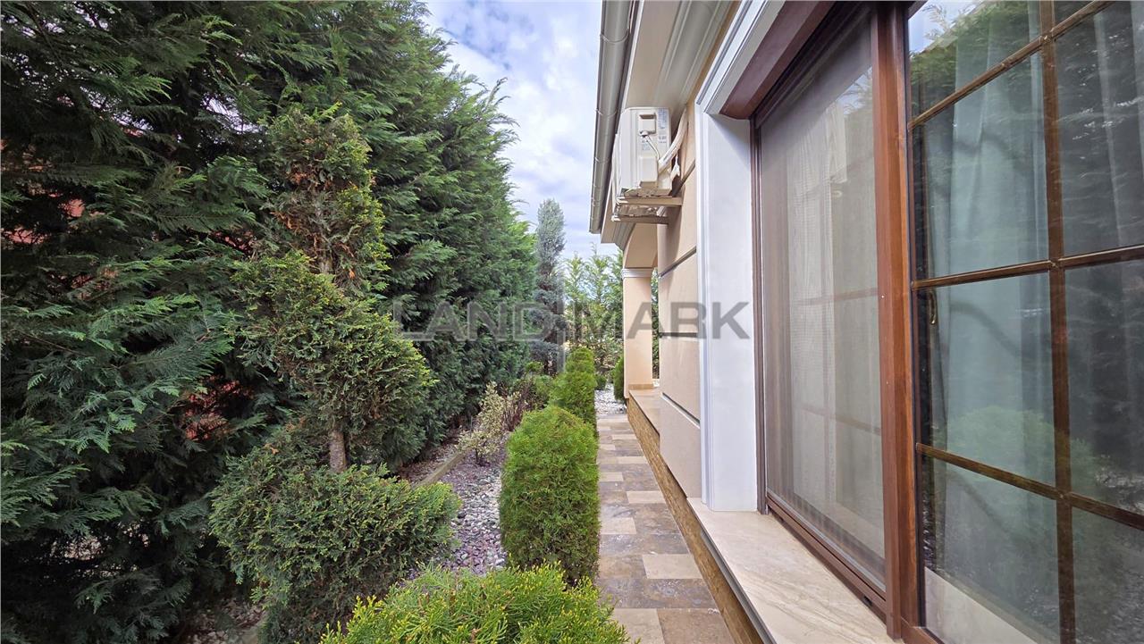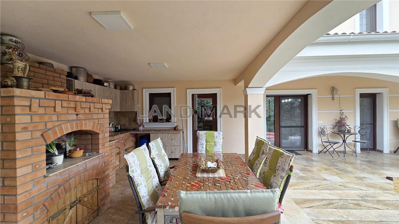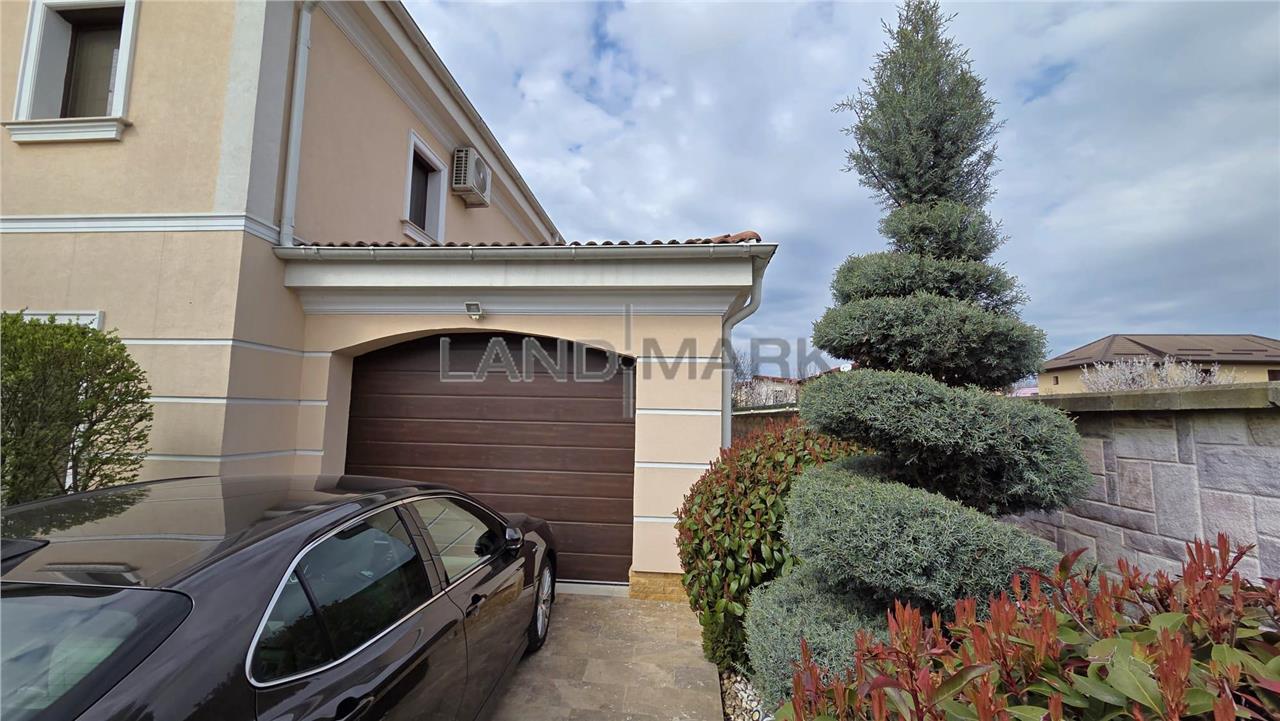 La parter, proprietatea te întâmpină cu un hol de acces primitor, o baie modernă cu duș, precum și un dormitor. Zona de zi este definită de un living generos, luminos, perfect pentru relaxare și socializare, iar bucătăria inchisa, frumos mobilata si utilata, oferă funcționalitate și intimitate. Atât livingul, cât și bucătăria au acces direct către două terase acoperite, decorate cu travertin, însumând aproximativ 60 mp – un spațiu ideal pentru petrecerea timpului în aer liber, complet echipat cu zonă de dining, cuptor de pizza, grătar, mobilier și baie proprie. De asemenea, există acces direct din casă către garaj de 30 mp plus camera tehnica si spalatorie.