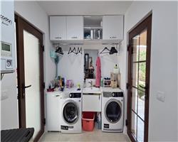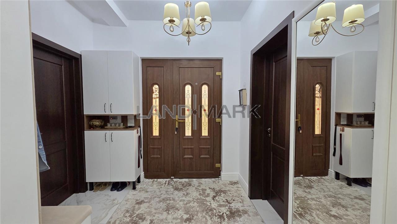 Amenajările interioare sunt realizate cu accent pe confort și eficiență: tâmplărie cu geamuri tripan și rulouri automatizate, sistem de aer condiționat instalat atât la parter, cât și la etaj. Locuința dispune de spălătorie complet utilată cu mașină de spălat și uscător AEG. Construcția este solidă, cu placă de beton între niveluri și pod izolat, asigurând un bun confort termic pe tot parcursul anului.