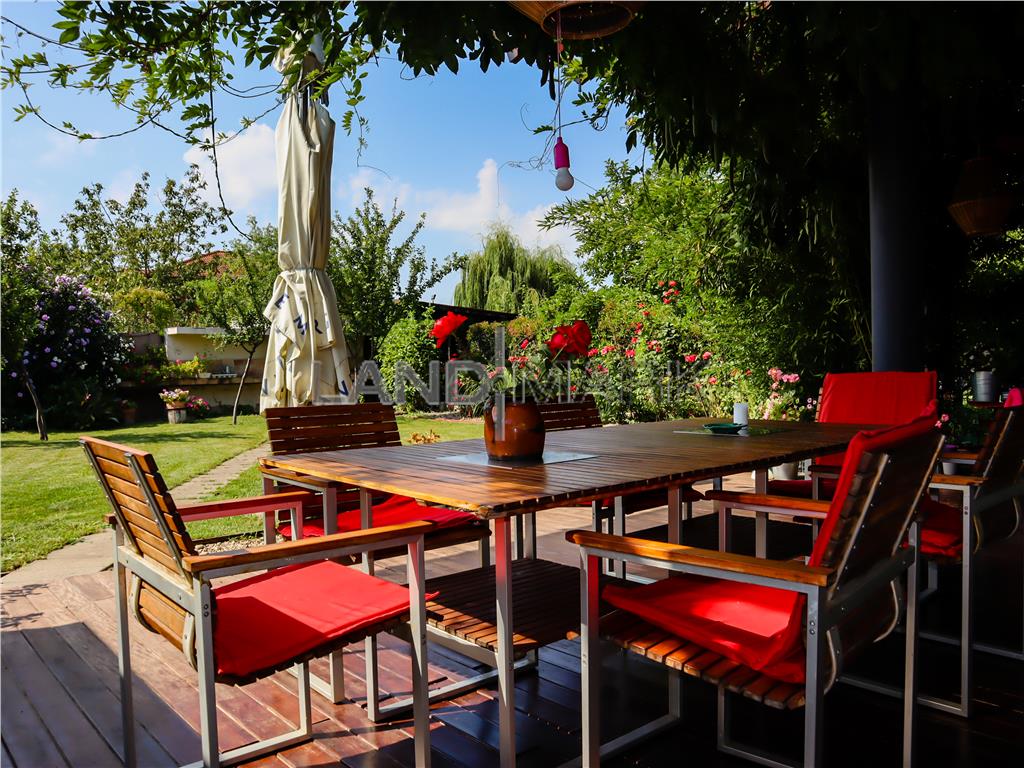 Pentru irigarea spațiului exterior există foraj propriu. Acoperișul casei este orientat către sud și este perfect pentru instalarea de panouri solare.Terasa acoperita are 60mp si este prevazuta cu pardosea din lemn exotic (teak).Spațiul exterior conține alei, gazon, arbori tineri (cu coroană dezvoltată), precum și arbuști, pomi fructiferi(cu rod excelent) și flori. În proximitatea terasei este amenajată o zonă generoasă pentru grill.