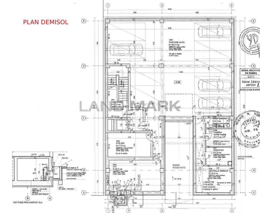 Subsol = 287 mp utili, compus din parcare auto 8 locuri , centrala termica, spatii depozitare, grup sanitar