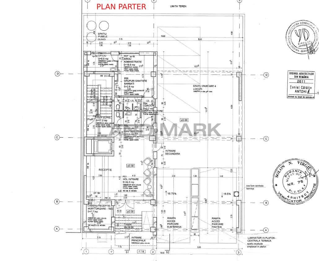 Parter = 102 mp utili,, compus din hol acces, receptie, lift, casa scarii, spatii birouri , camera tehnica, curte privata cu acces controlat, parcare auto 4 locuri.