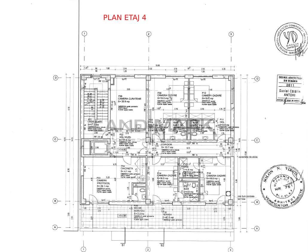 Etaj 4 = 192 mp utili - compus din sala consiliu, oficiu, grupuri sanitare, 3 camere regim hotelier cu baie proprie , terasa deschisa 42 mp